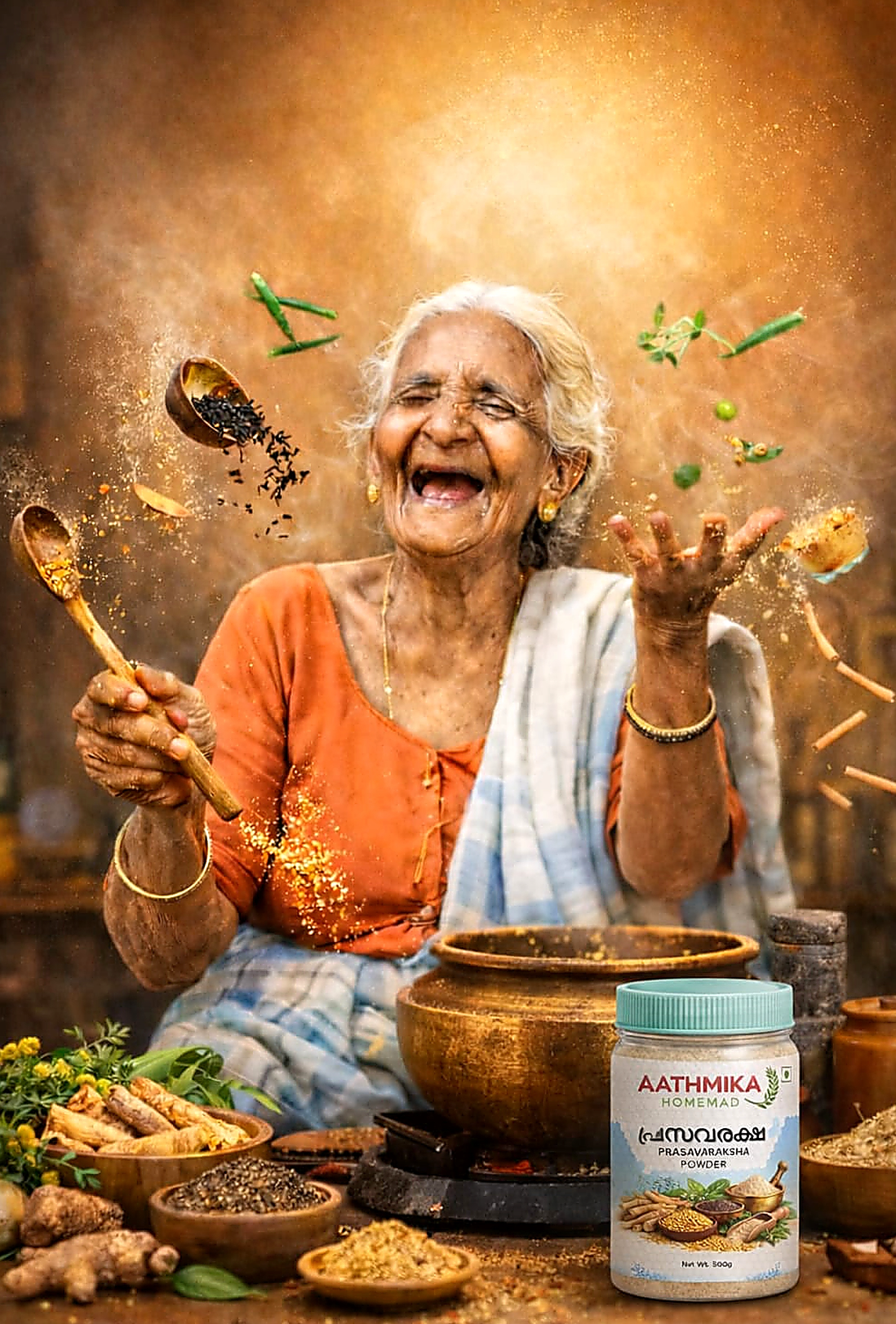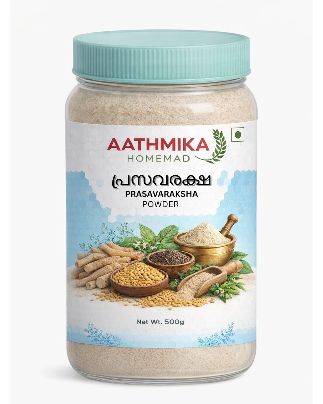 AATHMIKA Homemade പ്രസവരക്ഷ പൗഡർ പരമ്പരാഗത ആയുർവേദ രീതിയിൽ തയ്യാറാക്കിയ ഒരു ഹെർബൽ മിശ്രിതമാണ്. പ്രസവാനന്തര കാലഘട്ടത്തിൽ സ്ത്രീകളുടെ ശരീരശക്തി വീണ്ടെടുക്കാനും, ദഹനം മെച്ചപ്പെടുത്താനും, ശരീരവേദന കുറയ്ക്കാനും സഹായിക്കുന്ന പ്രകൃതിദത്ത ചേരുവകളാണ് ഇതിൽ ഉൾപ്പെടുത്തിയിരിക്കുന്നത്.